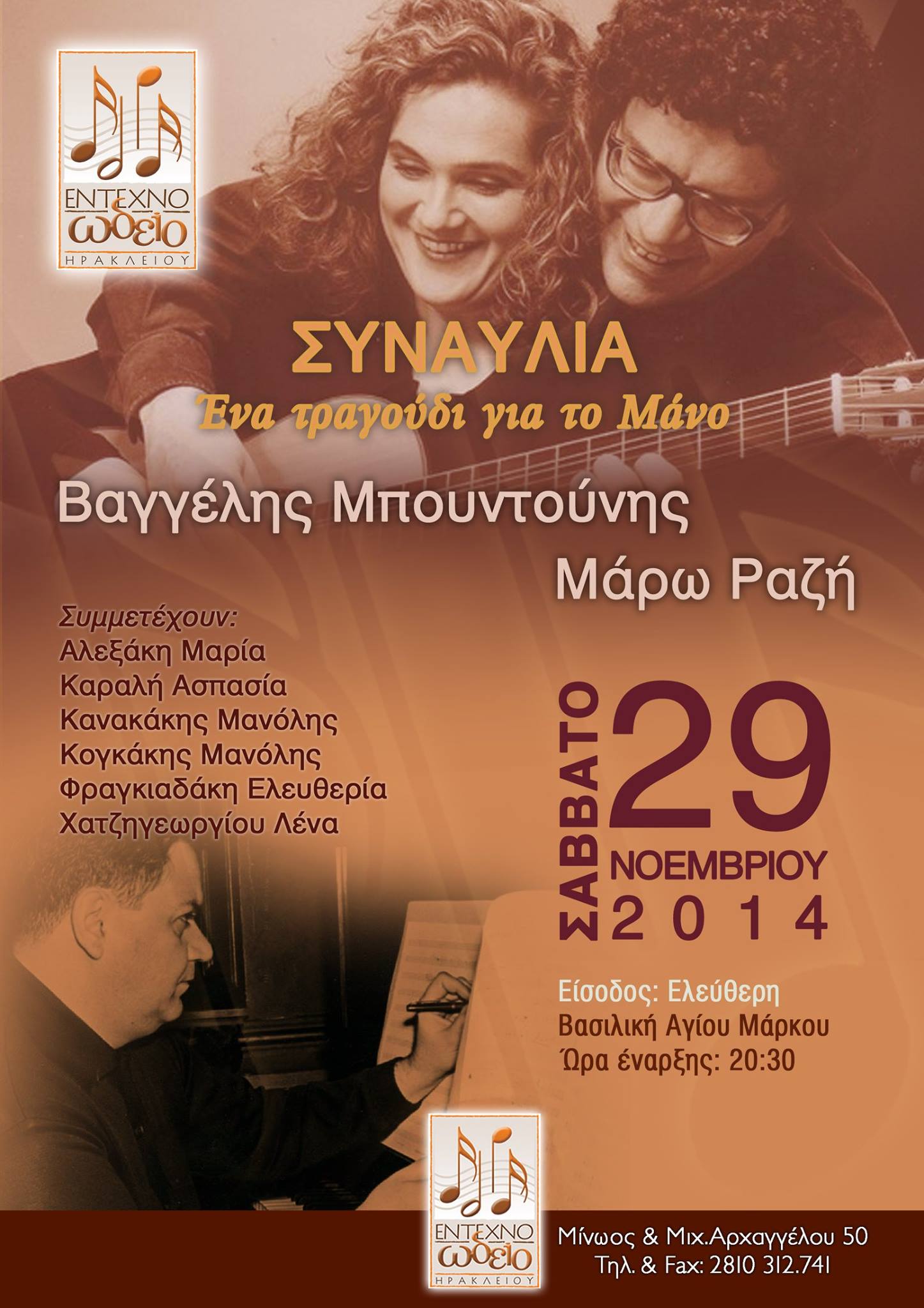 Στις 29 Νοεμβρίου 2014 το Έντεχνο Ωδείο παρουσιάζει το αφιέρωμα στο Μάνο Χατζιδακι με τίτλο “Ένα τραγούδι για το Μάνο” με τους Ευάγγελο Μπουντούνη και Μάρω Ραζή.